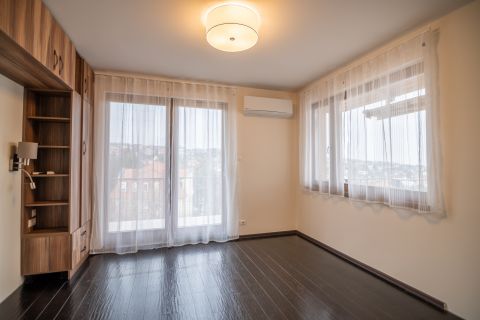 A nyári pihenést a teraszon, motoros árnyékoló teszi még kényelmesebbé. A kisebb erkély kicsit több mint 8 nm-es, a két hálószobát köti össze.