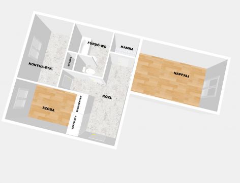 A két szobán kívül, a lakás magában foglal egy tágas konyha-étkezőt, egy előszoba-közlekedőt, egy fürdőszoba-WC-t és egy kamrát.