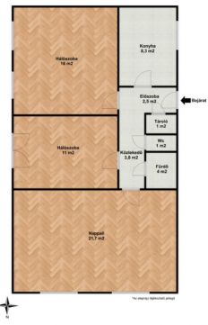 - Nappali, hálószoba, hálószoba, konyha, fürdőszoba, toalett, kamra, előszoba, közlekedő