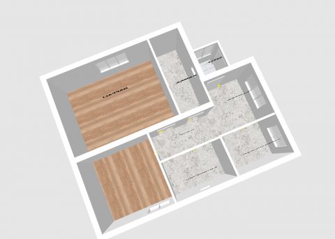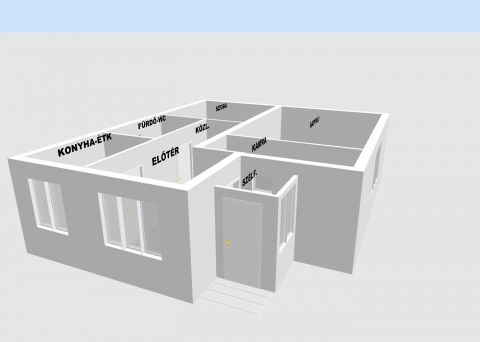 A két szobán kívül konyha-étkező, fürdőszoba-WC, kamra, előszoba, kazánház helységek lettek kialakítva.