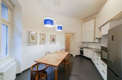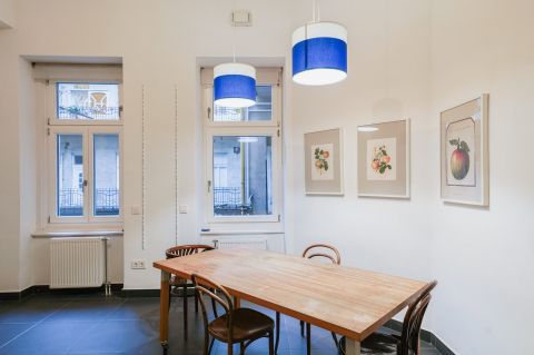 A reprezentatív előtérből nyílik a korszerű gépekkel felszerelt, étkezővel összekapcsolt konyha, amelyet kamra egészít ki. A szalonként funkcionáló nappali a lakás központi eleme, jellegzetes formájával. nagy belmagasságának köszönhetően, elegáns megjelenésével különleges atmoszférát teremt.