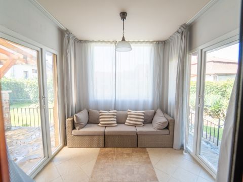 Fa nyílászárók hőszigetelt üvegezéssel, alumínium redőnyökkel. A fűtésről 2 éves kondenzációs gázkazán gondoskodik, radiátoros hőleadással. A nappaliban kandalló, a házban klíma, riasztó- és kamerarendszer, LED világítás.