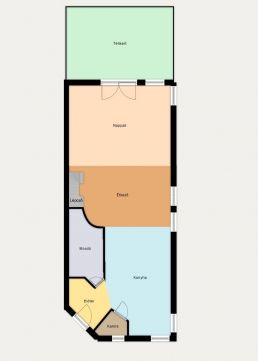 - Földszint: nappali, étkező, konyha, kamra, zuhanyzós fürdő WC-vel, télikert, fedett terasz
