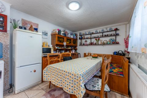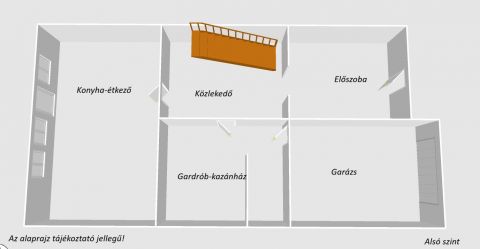 Tágas konyha–étkező, ahonnan közvetlen kijárat nyílik a kertbe, előszoba, kamra és gardrób.