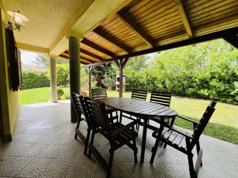 A tágas, fedett terasz kiváló helyszíne baráti és családi összejöveteleknek, a gondozott kert és a medence pedig valódi nyaralóhangulatot teremt a mindennapokban.