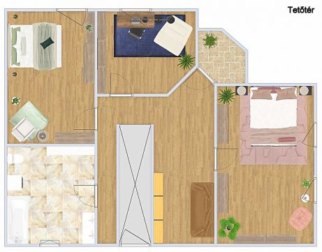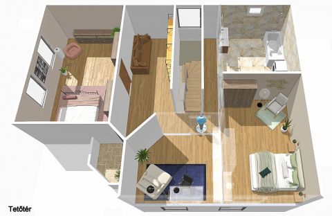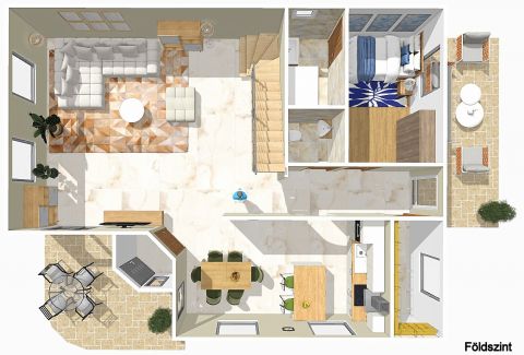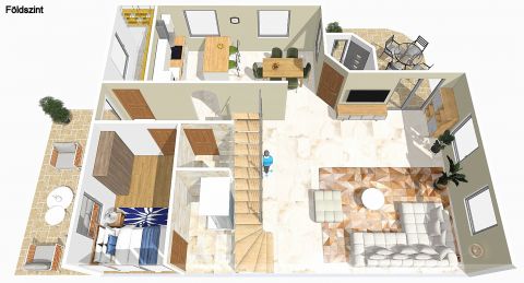 A földszinten egy tágas nappali–étkező–amerikai konyha alkotja a családi élet központját, továbbá egy külön hálószoba saját fürdőszobával, amely ideális lehet nagyszülőnek, vendégnek vagy otthoni irodának. Előszoba, kamra és külön WC egészíti ki a szintet. Az emeleten három jól bútorozható hálószoba, fürdőszoba és közlekedő található, míg az alagsor tárolóként és kazánházként funkcionál.