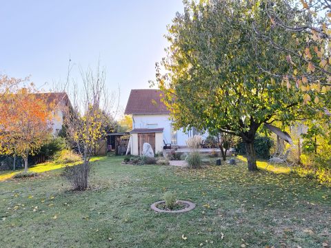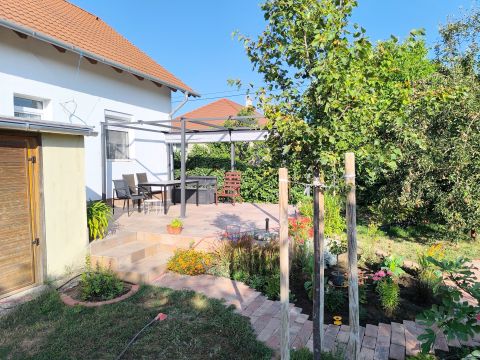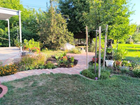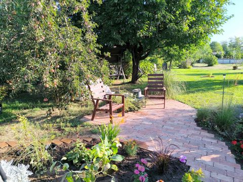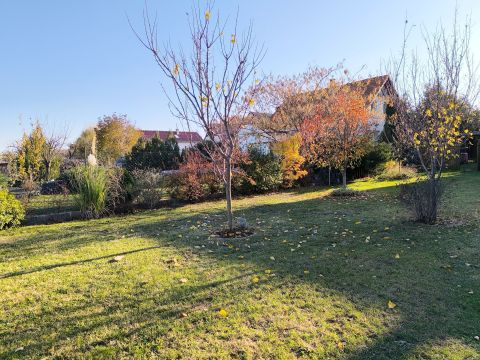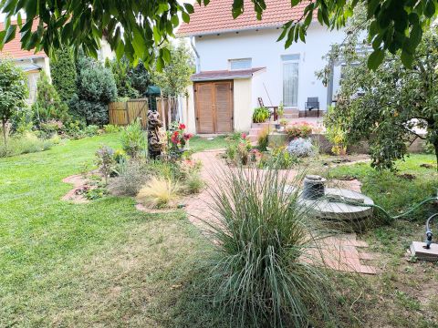 A sík, körbekerített kert biztonságos játszóteret kínál gyermekeknek, miközben gyümölcsfák, bogyós növények és szőlő teremtik meg a természetközeli életérzést. A fedett (13 m²) és a tágas, nyitott (35 m²) terasz ideális helyszín családi és baráti összejövetelekhez. Az udvaron 8 m²-es tároló, egy 3,5×7 méteres gépkocsibeálló, valamint további parkolási lehetőség áll rendelkezésre.