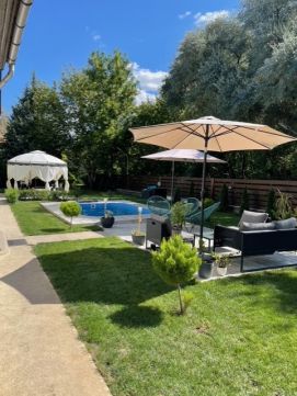 A kertben kialakított 15 m²-es medence a nyári pihenés központja, míg a 10 kW-os napelemrendszer hosszú távon gazdaságos fenntartást biztosít.