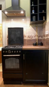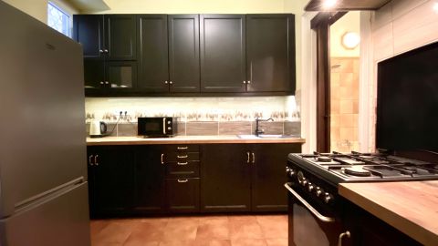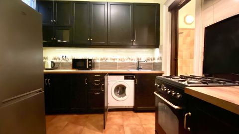 - gépesített konyha (gáztűzhely, villanysütő, hűtő, beépített mosógép, elszívó)