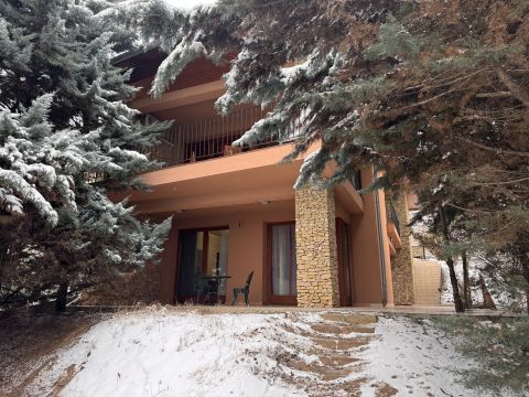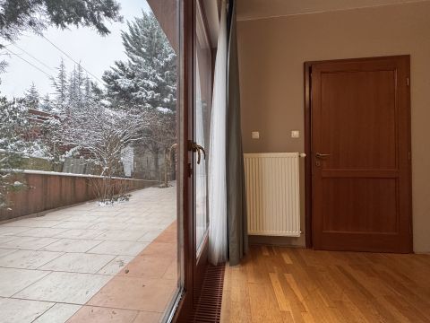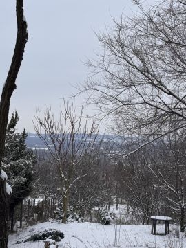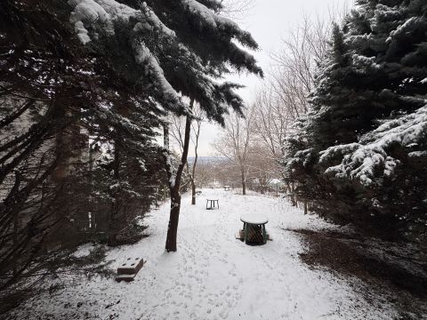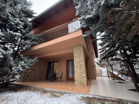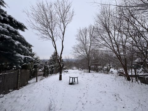 1326m2-es egészséges méretű kertje kényelmes elosztású, szekciókra osztva használja ki a teleklejtést, így pihenésre és kikapcsolódásra ugyanúgy jut hely, mint konyhakert telepítésre, grillterasz létesítésre és még mindig marad terület kerti játszótérnek, medencének. A ház elé terebélyesedő tekintélyes ősfenyők bástyaként védik a házat és keretezik a panorámát.