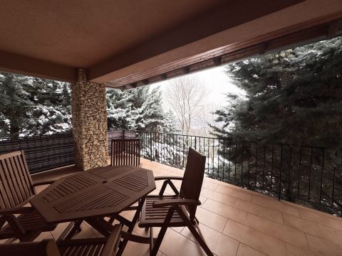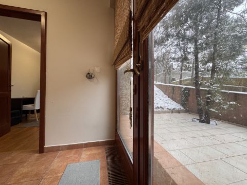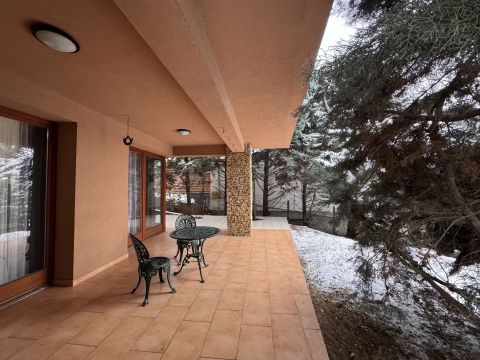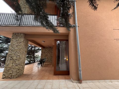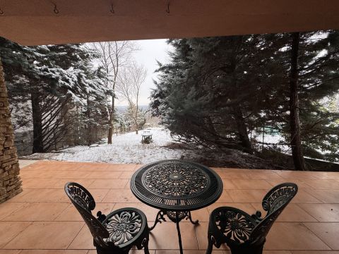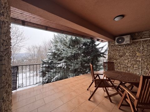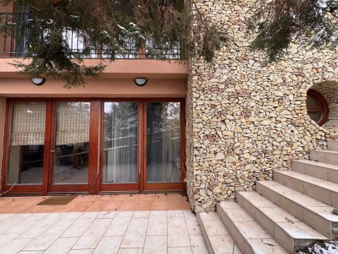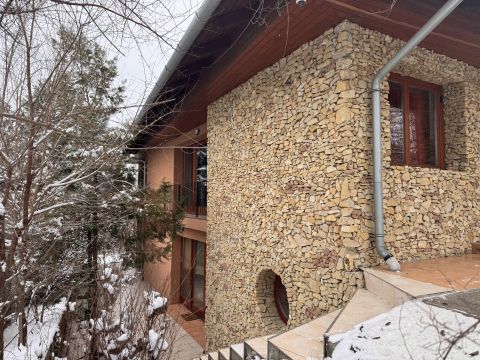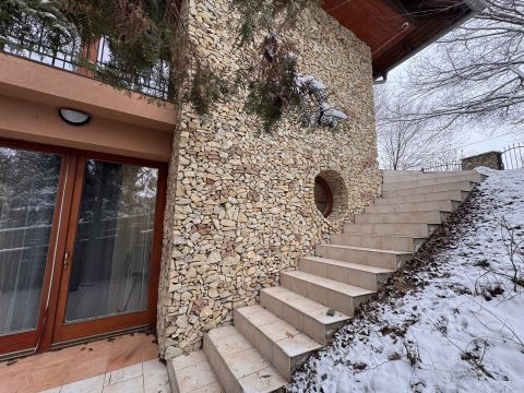 Az épület nem hivalkodó, csak kerten belülről sejlik fel a robosztus terméskővel fedett homlokzat, és a teraszra érve látszik a Hármashatár-hegyig nyíló zavartalan örökpanoráma.