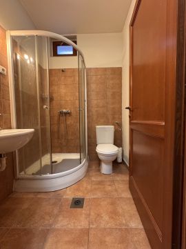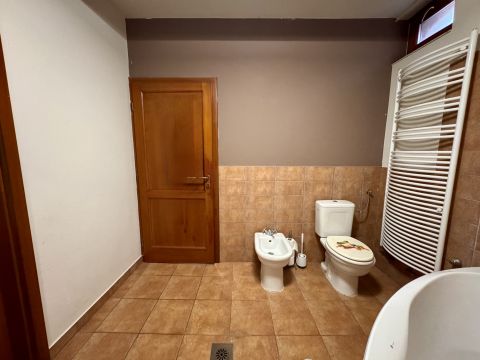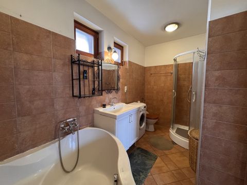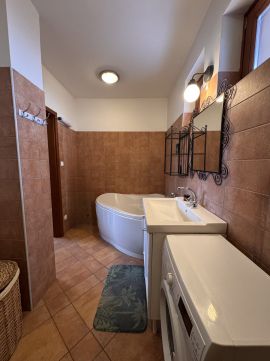 -1.szint: konyha-étkező, közlekedőfolyosó, zuhanyzó+WC, nagy fürdőszoba káddal, WC+bidével, gépház/háztartási helyiség, 3 hálószoba, nagy fedett terasz