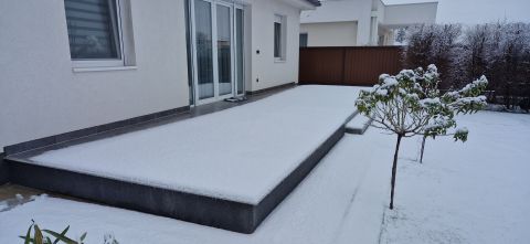 * A fedett előtér mellett 29 m2-es hátsó terasz kapcsolódik a nappalihoz
