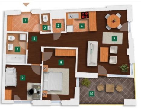 Alapterület: 65 nm (amerikai konyhás nappali és két külön nyíló hálószoba).