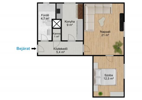Belépve világos, levegős terek fogadnak. A délkeleti fekvésnek és a parkos környezet felé néző ablakoknak köszönhetően a fény természetesen járja be a lakást. A nappali tágas, jól bútorozható tér, innen nyílik a hálószoba, amely valódi pihenőteret ad. A külön konyha ablakos és jól használható, a fürdő, a kamra és a közlekedő pedig logikusan illeszkedik az alaprajzba.