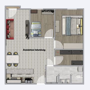 Nagy alapterületének köszönhetően egy plusz hálószoba leválasztására is lehetőség van, így könnyen nappali plusz 2 hálószobássá alakítható.