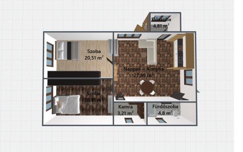 két külön nyíló szoba mellett egy nappali–konyha–étkező egybenyitott tér biztosítja a családi élet központját. Emellett fürdőszoba, előszoba és kamra is helyet kapott. A nappaliból közvetlen kijárat nyílik a 22,67 nm-es, nagy fedett teraszra, amely tökéletes helyszíne lehet pihenésnek, baráti összejöveteleknek vagy akár egész évben használható kültéri élettérnek.