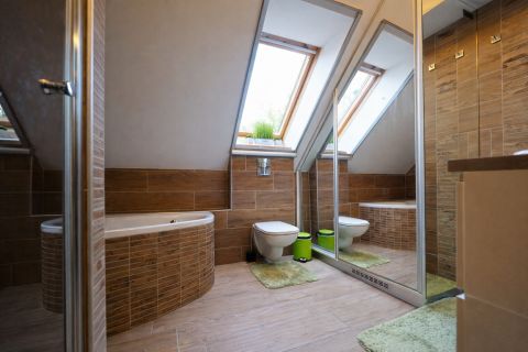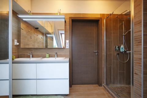 Fürdőszoba: kád, zuhanyzó és dupla mosdó