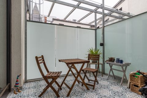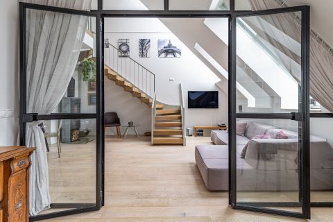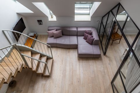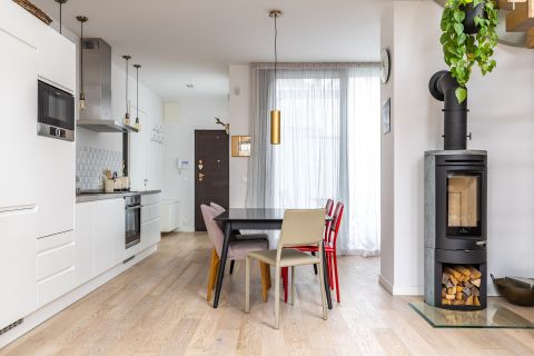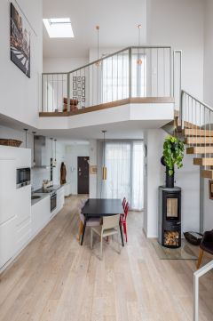 Kétszintes (duplex) kialakításával, tágas és szellős lakótereivel, valamint teraszával ez az otthon 2018-ban, ráépítéssel készült, tudatos tervezéssel, világos struktúrával és jól működő térarányokkal. A nagy belmagasság és a nagyméretű nyílászárók természetes fényt engednek be egész nap, ami érzetben lendületet és átláthatóságot ad a lakás minden pontján – különösen az alsó szint nyitott nappali–étkező–konyha terében.
