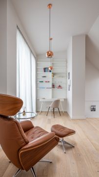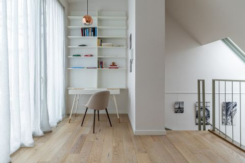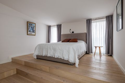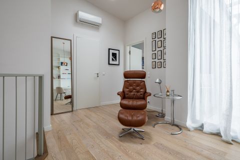 Felül már egyértelműen a visszavonulás és a fókusz kap szerepet. A galériás dolgozótér után érkezünk a hálószobába, ahonnan panorámás kilátás nyílik a Városmajor zöldjére és a Budai-hegyekre – egyszerre inspiráló és megnyugtató perspektívát adva. A walk-in gardrób és a második, ablakos, zuhanyzós fürdőszoba tisztán elkülöníti a privát zónát, miközben a tér érzetében továbbra is nyitott marad.