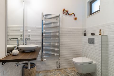 Végig tölgyfa parketta ad természetes, időtálló alapot a belső tereknek, harmonikus összhangban a fürdőszobák letisztult, modern burkolataival.