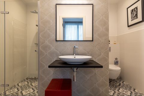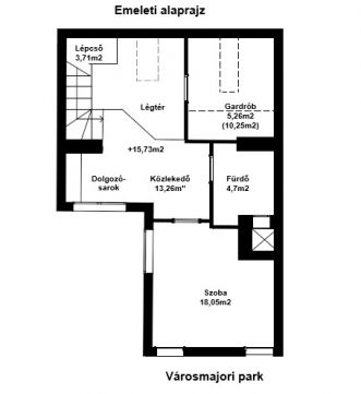 Üvegfallal leválasztott szoba szolgál vendégszobaként vagy dolgozótérként – elkülöníthető, mégis vizuálisan kapcsolódó megoldásként, amely rugalmasan alkalmazkodik az aktuális élethelyzethez. Ezen a szinten található a zuhanyzós fürdőszoba padlófűtéssel és bidével, valamint egy külön háztartási/tároló helyiség, amely rendet, kontrollt és kényelmet visz a mindennapokba.