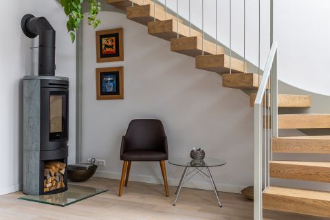 Az alsó szinten egy olyan élettér alakul ki, ahol könnyű mozogni, együtt lenni és döntéseket hozni. Logikusan kapcsolódik egymáshoz a modern, teljesen gépesített konyha, az étkező és a nappali, így a tér egyszerre hatékony és befogadó. Meleg hangulati fókuszpontként jelenik meg a fatüzelésű kandalló, amely karaktert ad a térnek, miközben a nappali továbbra is jól használható marad vendégfogadáshoz vagy egy csendesebb estére.