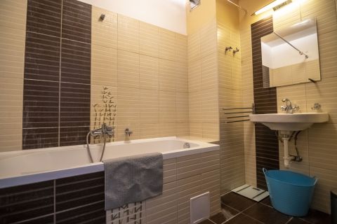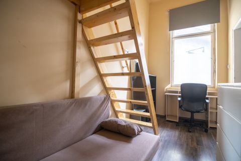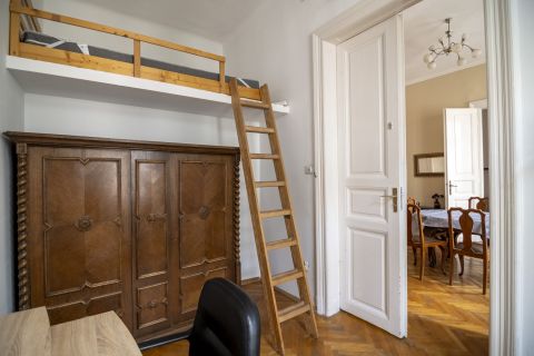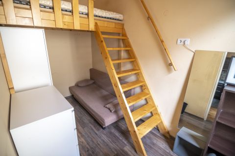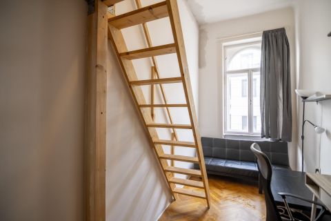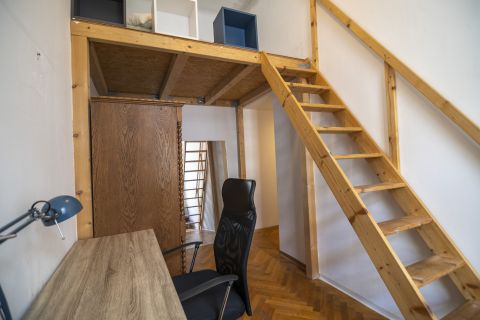 A lakás jelenlegi kialakítása szerint a 24 m2-es nappali mellett 4 külön bejáratú kis szoba található, amelyből 3 galériával rendelkezik. Külön konyha, fürdő, WC.