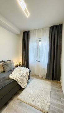 Az erkély és a nagy ablakok csendes, zöld kertre néző panorámát biztosítanak, így a városi nyüzsgés ellenére valódi nyugalom várja az itt lakókat – az erkély tökéletes hely egy reggeli kávéhoz vagy egy esti kikapcsolódáshoz.