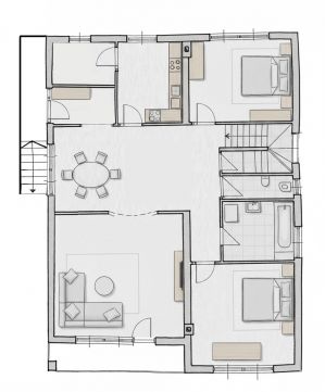 A földszinti lakórész nappali, 2 hálószoba, konyhaspájz, étkező, kádas fürdőszoba, külön mellékhelyiség elrendezésű.