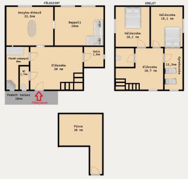 •földszinti hasznos terület: 72 m²,