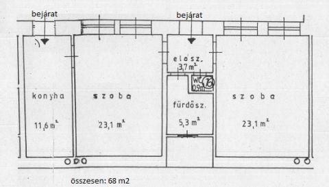 Az alaprajz nagy előnye, hogy kétbejáratos és könnyen két lakássá alakítható, jelenleg is két villanyóra van.
