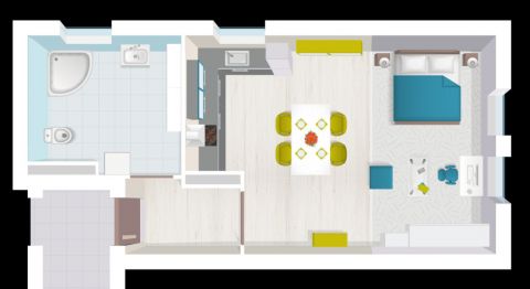 Az lakás egy szobás, egy fürdőszobás elrendezésével maximálisan kihasználja a teret, így a mindennapi élet kényelmét tudja biztosítani.