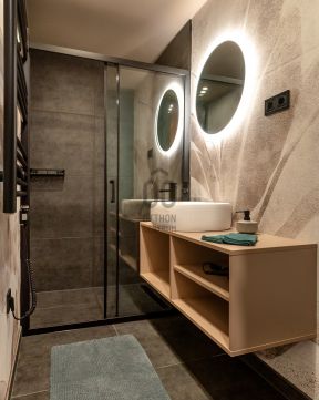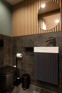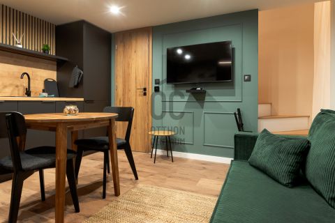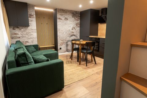 Az alsó szinten amerikai konyhás nappali–étkező kapott helyet, modern, gépesített konyhával, míg a felső szinten egy külön hálószoba és fürdőszoba található. A lakás külön WC-vel is rendelkezik, ami ritka és kifejezetten praktikus megoldás ebben a méretkategóriában.