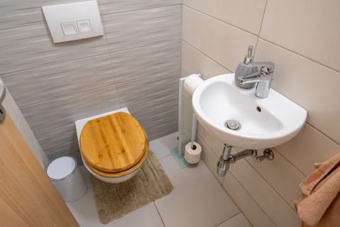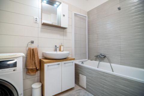 A fürdőszobában kád található, amelyhez zuhanyzó paraván került felszerelésre.