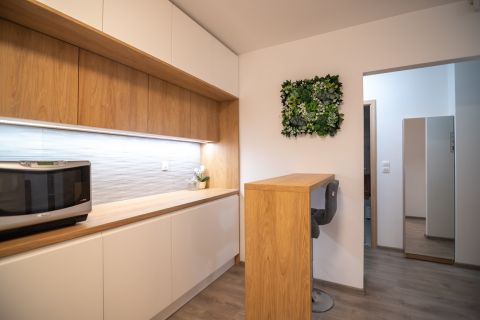 A konyhabútort, fürdőszobabútort és a hálószobai beépített szekrényt a WOODARTIS csapata készítette, egyedi tervezés alapján.