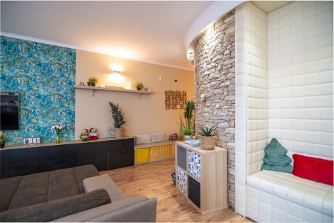 Részei: tágas amerikai konyhás nappali, 2 hálószoba. fürdőszoba, közlekedő, előszoba