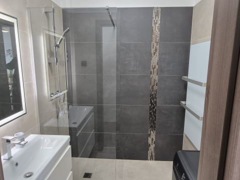 •Mosdószekrény mosdóval, zuhanyfal és LED világítású tükör;