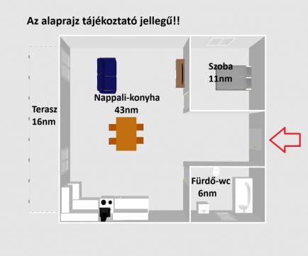 A 420 nm-es telken elhelyezkedő ingatlan modern, praktikus elrendezésű: egy tágas, 43 nm-es amerikai konyhás nappali és egy kényelmes hálószoba biztosítja az otthonos életteret. A 16 nm-es terasz tökéletes helyszín a reggeli kávéhoz vagy esti kikapcsolódáshoz.
