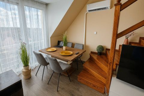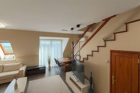 Az ingatlan a liftes társasház 4. emeletén található, 62m²-es, kétszintes (tetőtéri) kialakítású. Az alsó szinten egy világos, tágas, amerikai konyhás nappali kapott helyet, amelyhez franciaerkély kapcsolódik, valamint egy praktikus, lépcső alatti tároló.