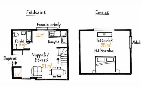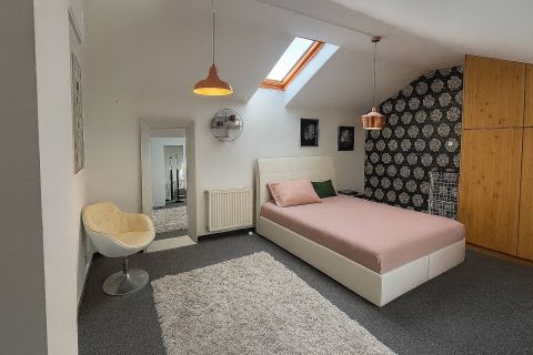 A felső szinten található a kifejezetten nagy méretű hálószoba, amely alapterületének köszönhetően (bruttó 25m², hasznos 19m²) igény szerint akár két különálló tárre is osztható, így a lakás rugalmasan alakítható két hálószobássá.