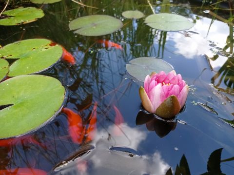 A ház környékén két kis minitó, jó néhány gyümölcsfa és cserje; számos díszítő és hasznos kis ágyás található, illetve egy 45 négyzetméteres terasz egy kombinált mosdóhelyiséggel.