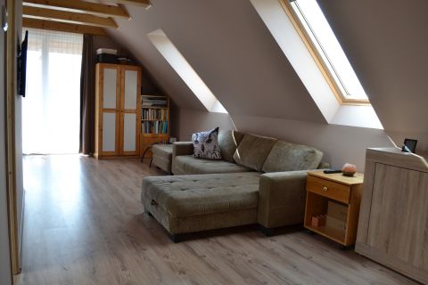 A konyha és étkező rendelkezik egy saját kis tárolóval, elektromos padlófűtéssel. A felső szinten található a fürdőszoba, a nagy méretű nappali és a két szoba. A fürdőben elektromos padlófűtés van, a többi helyiségben infra padlófűtés. Az egész szint fűthető, hűthető egy 3,5KW-os klímaberendezéssel. Itt található egy bazalt kővel burkolt kémény lemezkandallóval. A tűzifatároló az erkélyen található, amely igény esetén könnyen beépíthető egy plusz szobává. A lakás összesen körülbelül 70 négyzetméter, amely további körülbelül 50 négyzetméterrel a tervek alapján bővíthető.