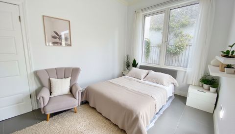 A lakás egyik legnagyobb előnye a csendes, zárt belső udvar, ahová az ablakok néznek – ideális hely egy kis asztalnak, székeknek, növényeknek.