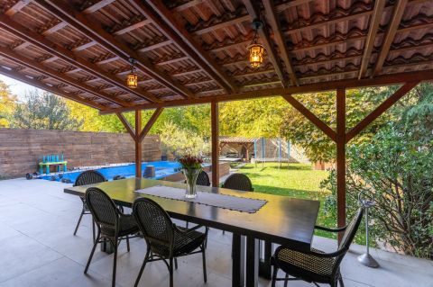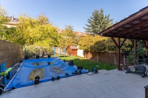 A házhoz tartozik egy 403 négyzetméteres telek, amely rendezett kerttel rendelkezik. A füvesített kertben kiépített öntözőrendszer, 3x5 méteres hőszivattyúval fűthető medence, fedett sütögető rész és egy kis faház tárolónak is megtalálható.