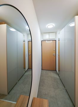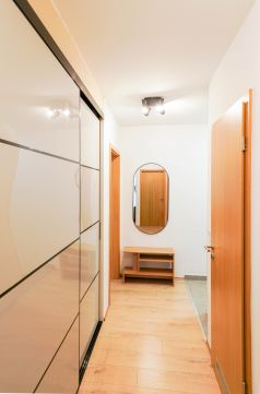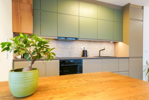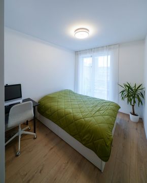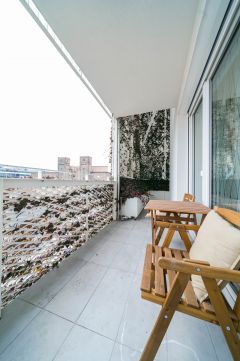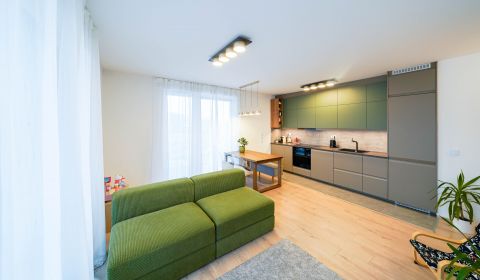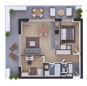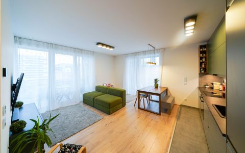 Az okosotthon applikációval felszerelt lakás nappali és két hálószobával, hatalmas üvegfelületekkel rendelkezik és igényes bútorokkal, magas kategóriájú gépekkel, teljeskörűen berendezett. A beépített bútorok, a gépesített konyha az ár részét képezik, a mobilis bútorzat opcionálisan megvásárolható.