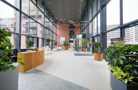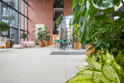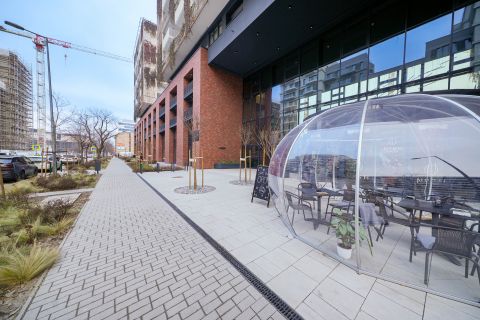 A bejáratnál található különleges kialakítású, hangulatos kávézó, akár az utcafrontról, akár a belső aulából is elérhető az itt lakók részére.