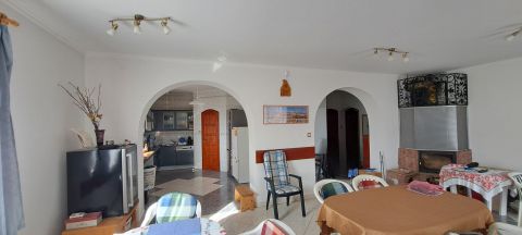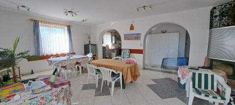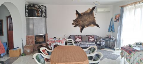 A ház bejárati ajtaján átlépve az előszobába érkezünk, innen nyílik egy fürdőszoba, mellékhelyiség, a tágas nappali az étkező résszel, hálószoba és a konyha, melyhez egy éléskamra kapcsolódik. A földszinten két klíma szolgáltatja a hűs levegőt. A nappaliból a teraszra érkezünk, amely hatalmas méretéből adódóan nagyobb családi, baráti rendezvényekre és összejövetelekre is alkalmas, ahonnan gyönyörködhetünk a tulajdonosok kezei által gondozott, sok gyümölcs-, és díszfával tarkított kertben.