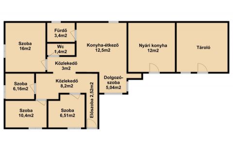 Az alapterületen belül helyet kapott egy tágas méretű nappali, továbbá egy kényelmes méretű konyha-étkező, valamint egy dolgozószoba. Három kisebb méretű hálószoba került kialakításra az optimális helykihasználás érdekében.