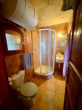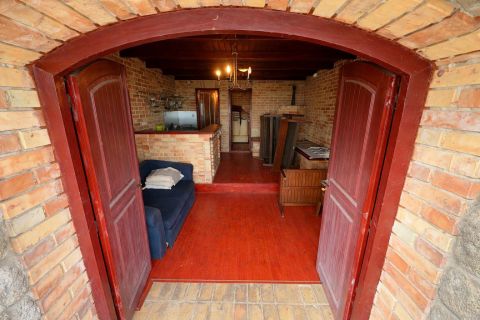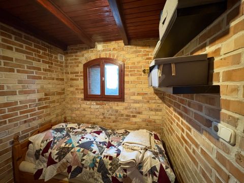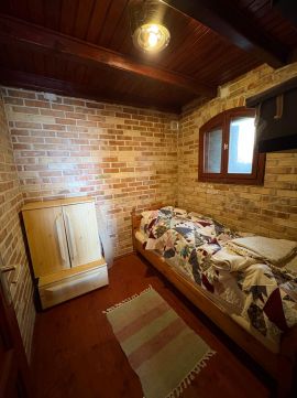 A közel 40 m²-es, régi pincéből átalakított kőház bensőséges hangulatú, tökéletesen átgondolt belső terekkel rendelkezik: amerikai konyhás nappali, hálószoba és fürdőszoba biztosítják a kényelmes pihenést. A fűtés hangulatos kandallóval megoldott – a hűvösebb esték itt valódi élménnyé válnak.